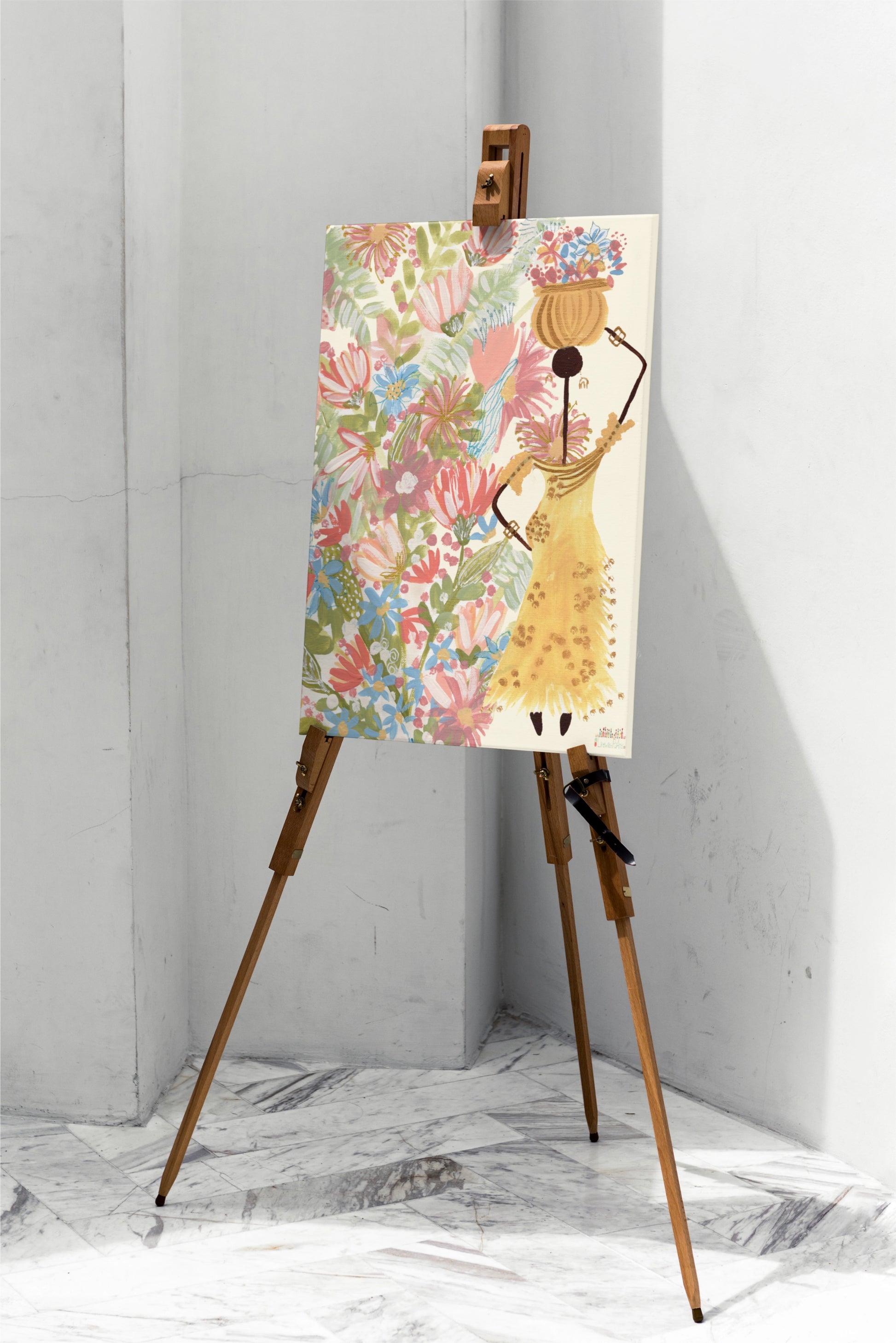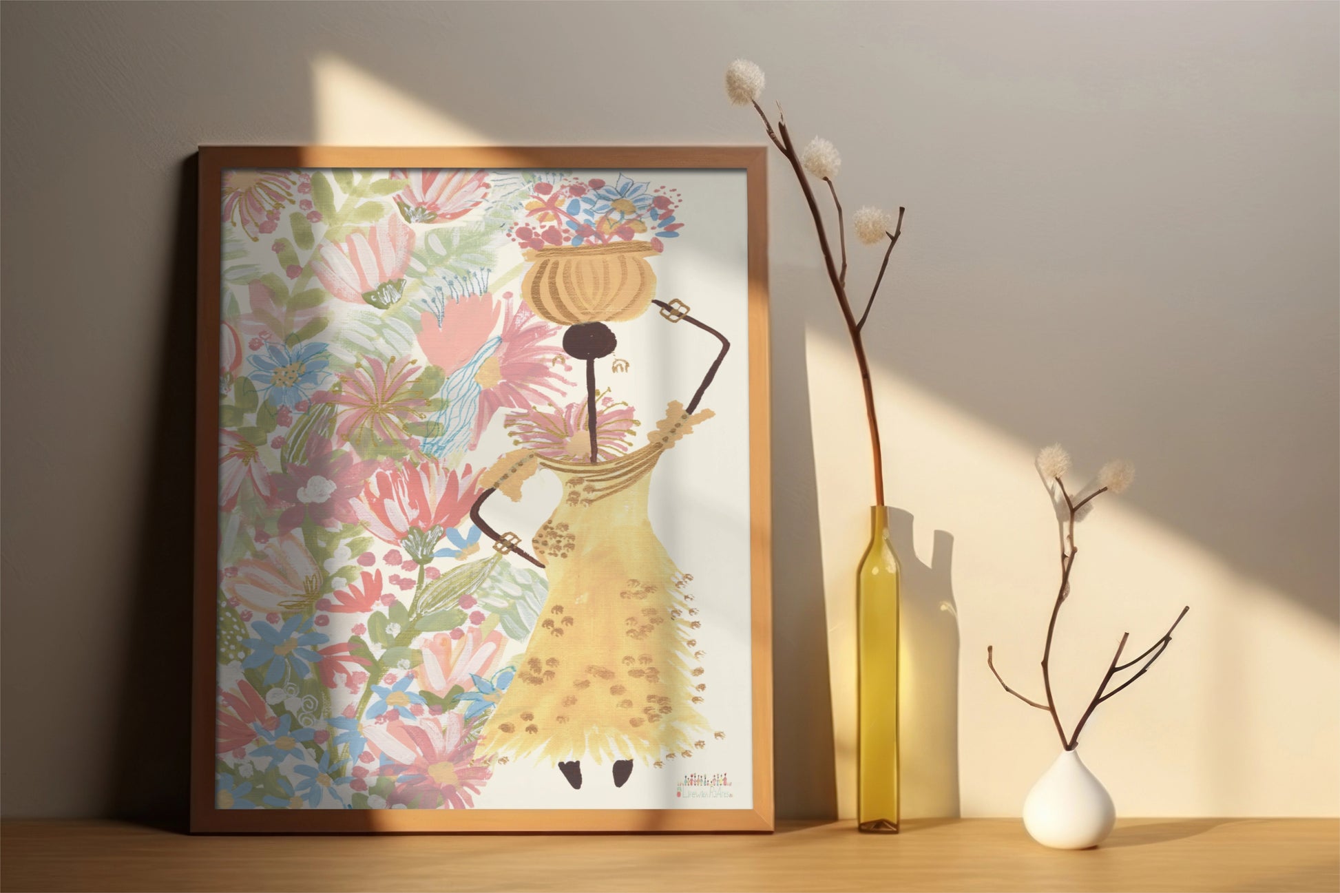 "Sunset Radiance" showcases a graceful figure adorned in a flowing yellow dress, balancing a basket of beautiful blooms atop her head. Surrounding her, a burst of colorful flowers in shades of pink, blue, and green create a lively and uplifting scene, evoking the warmth and beauty of a sunset.